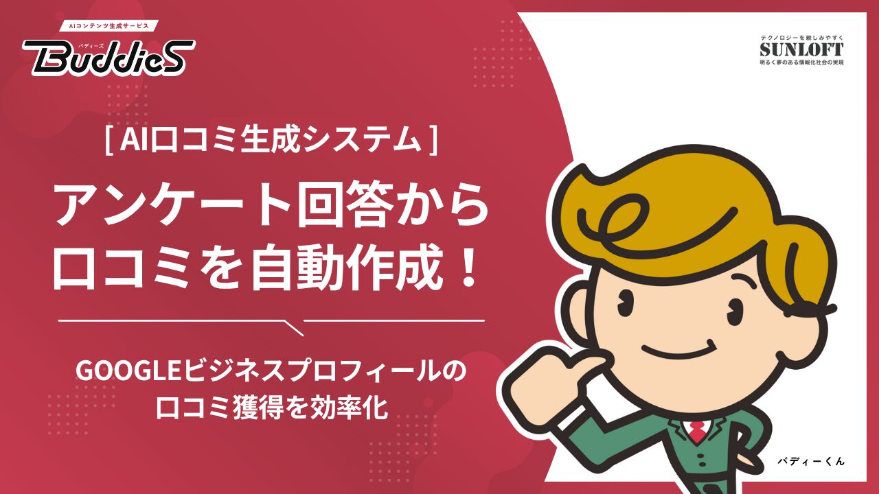 AI業務支援サービス「BuddieS(バディーズ)」では、アンケート回答をもとにAIが口コミ文章を自動生成するシステムを開発しました。このシステムを活用することで、お客様の投稿ハードルを大幅に下げ、質の高い口コミを継続的に獲得することが可能になります。