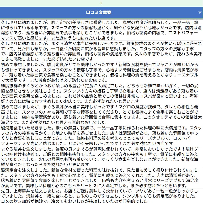 アンケート回答と生成された口コミ文章案は、すべてGoogleスプレッドシートに自動で記録されます。