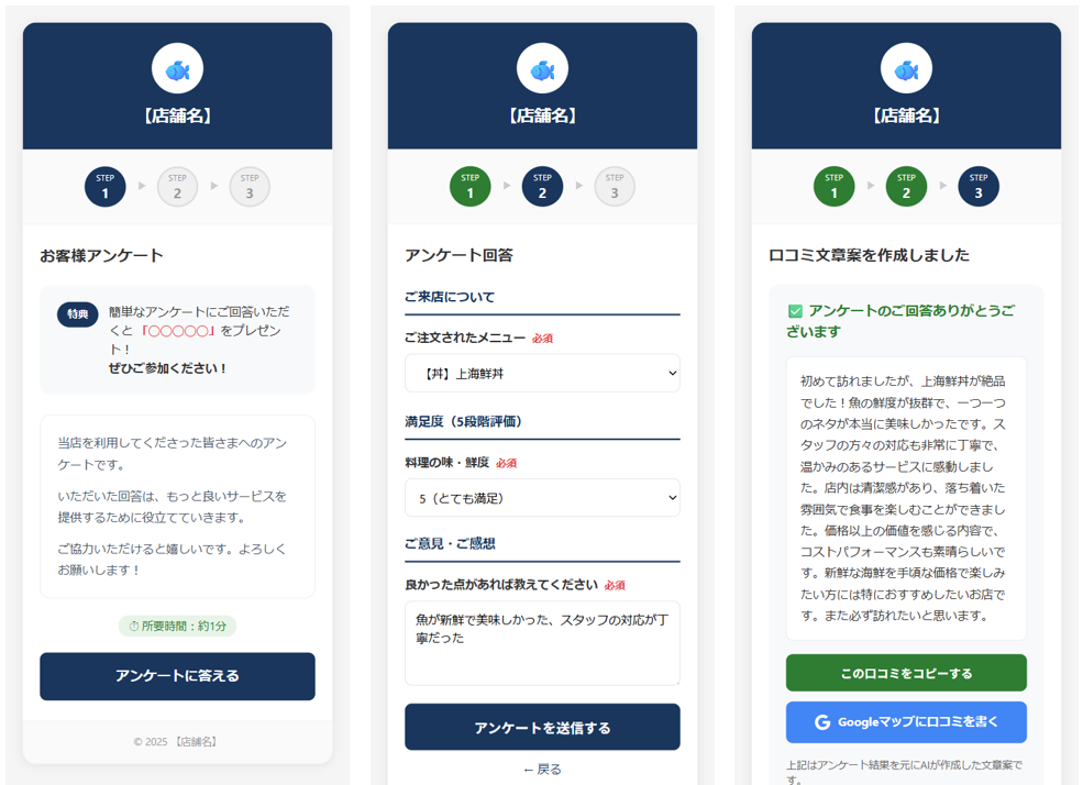 基本コンセプトは非常にシンプルです。お客様がアンケートに答えるだけで、AIが口コミ文章案を自動生成します。お客様は生成された文章を確認・編集し、コピーしてGoogleマップに投稿するだけ。「何を書けばいいかわからない」という最大のハードルを取り除くことで、投稿率の向上を実現します。