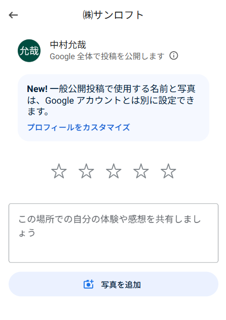 画面には「Googleマップに口コミを書く」ボタンが設置されており、タップするとGoogleマップの口コミ投稿画面に直接遷移します。お客様はコピーした文章をペーストし、星評価を付けて投稿するだけです。