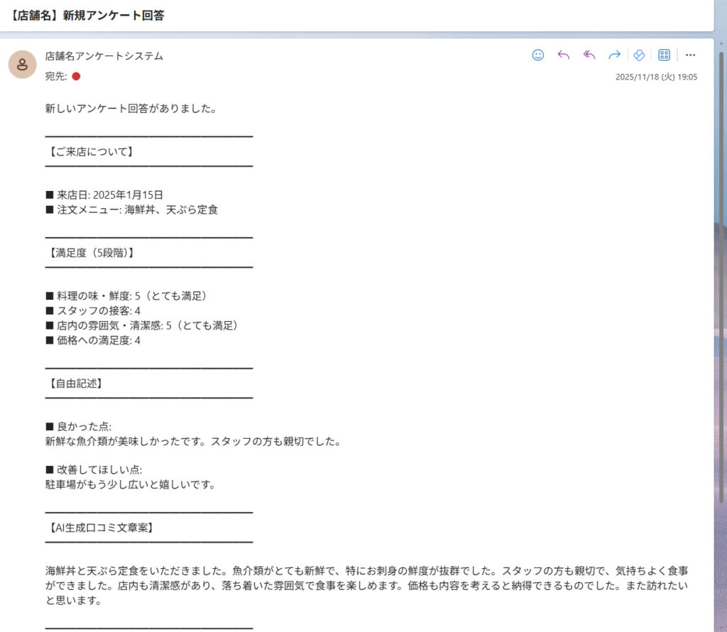 これにより、お客様の声をリアルタイムで把握でき、改善要望への迅速な対応が可能になります。特に、低評価や具体的な改善要望があった場合は、すぐにスタッフ間で共有し、サービス改善につなげることができます。