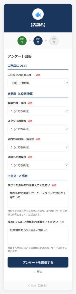 • メニュー選択肢:店舗の人気メニューや季節限定メニューをプルダウンで選択可能に