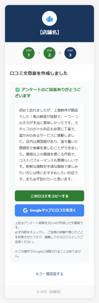 アンケートを送信すると、最新のAI(ChatGPT・Claude・Gemini)がお客様の回答内容をもとに、150〜250文字程度の口コミ文章案を自動生成します。