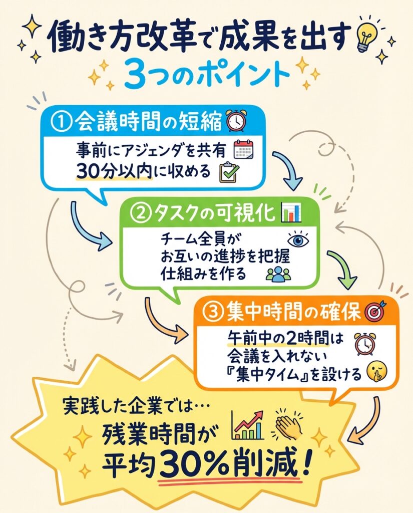 3.集中時間の確保:午前中の2時間は会議を入れない「集中タイム」を設ける。