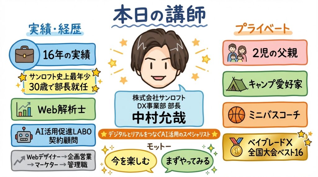 例えば、自己紹介やプロフィール紹介で効果を発揮します。中央に人物(名前・役職・イラスト)を配置し、周囲に「実績・経歴」「プライベート」「モットー」「趣味」などの情報を放射状に配置。セミナーや研修の講師紹介、採用ページの社員紹介、名刺代わりの自己紹介カードなど、「この人はどんな人か」を一目で伝えたい場面で活用できます。