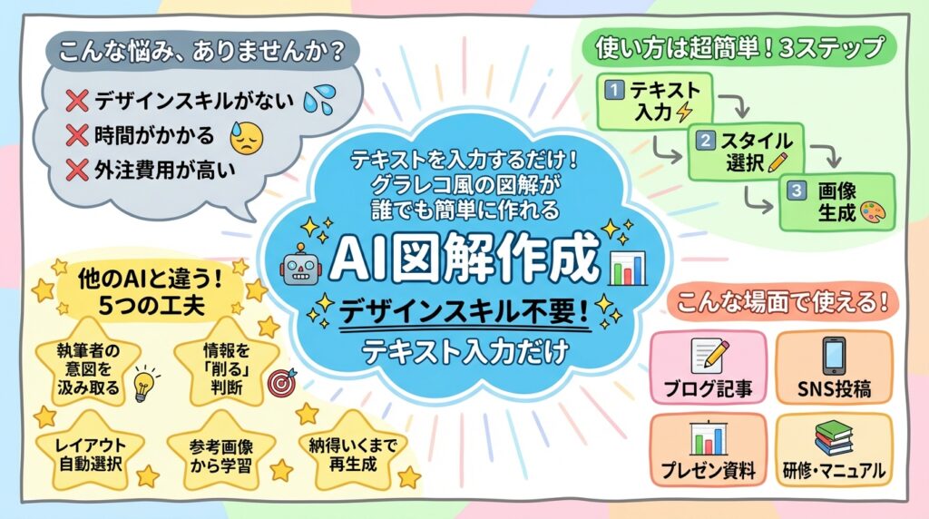 「資料に図解を入れたいけど、デザインスキルがない…」「グラレコ風のおしゃれな図解を作りたいけど、どうすればいいかわからない…」こんな悩みを抱えている方は多いのではないでしょうか。プレゼン資料やブログ記事、SNS投稿において、図解は情報を伝える上で非常に効果的です。文章だけでは伝わりにくい内容も、図解にすることで一目で理解してもらえます。