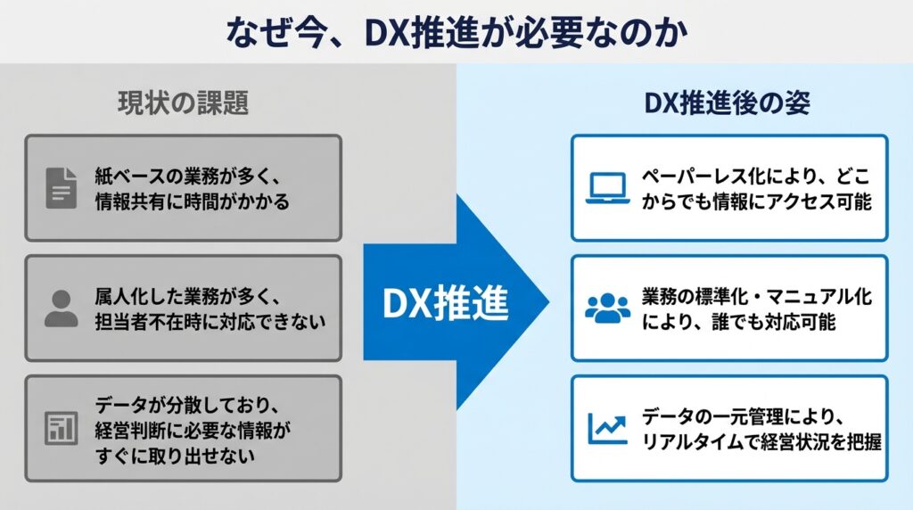 現状の課題:紙ベースの業務が多く、情報共有に時間がかかる。属人化した業務が多く、担当者不在時に対応できない。データが分散しており、経営判断に必要な情報がすぐに取り出せない。