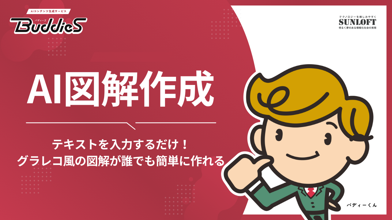 そんな課題を解決するのが、AIを活用した図解作成です。AI業務支援サービス「BuddieS(バディーズ)」の「図解作成(グラレコ作成)」機能を使えば、テキスト情報を入力するだけで、グラフィックレコーディング風の図解画像を自動生成できます。デザインスキルは一切不要。誰でも簡単に、プロ品質の図解を作成できる時代になりました。