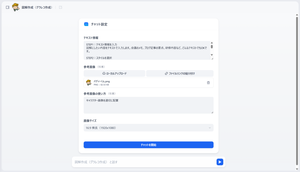「この画像のレイアウトを参考にして」「このキャラクターを右下に配置して」など、使い方を指定できるので、自社のブランドに合わせた図解も簡単に作成できます。