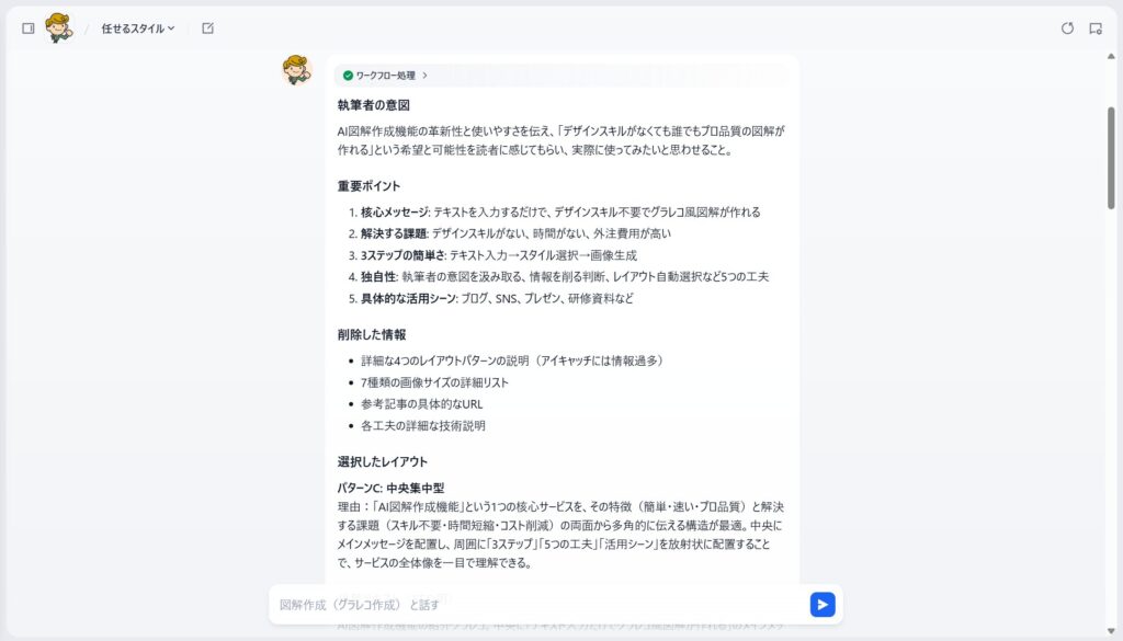 「執筆者の意図」「重要ポイント」「情報精査」「自動レイアウト選択」を実施