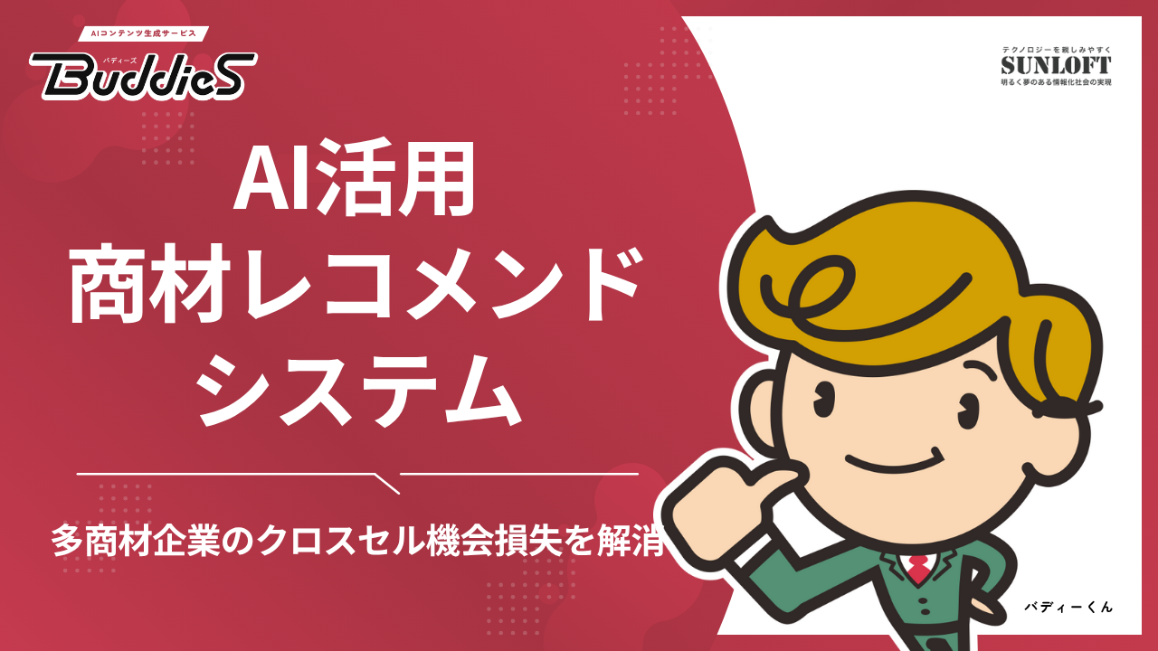 AI業務支援サービス「BuddieS(バディーズ)」の導入企業との共創から生まれた、AIによる自動商材レコメンドシステムをご紹介します。このシステムを導入することで、数万アイテムを扱う企業でも、営業担当者のスキルや所属部署に依存せず、常に最適なクロスセル提案が可能になりました。