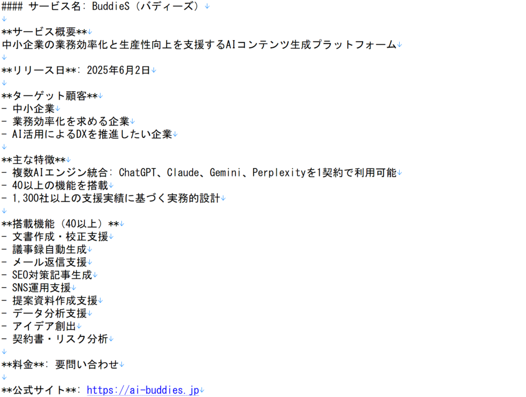 AI活用の社内浸透に最適: 複数のAIエンジン(ChatGPT、Claude、Gemini、Perplexity)を統合し、40以上の実務的な機能を提供するため、様々な部署・業務でのAI活用が可能です